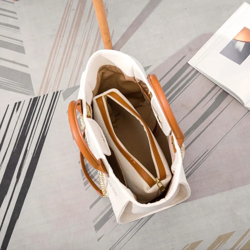 Doté de grandes anses en similicuir camel et de sangles en chaînes dorées, vous pouvez le porter selon vos envies. Il ajoutera une touche chic et élégante à n’importe quelle tenue.