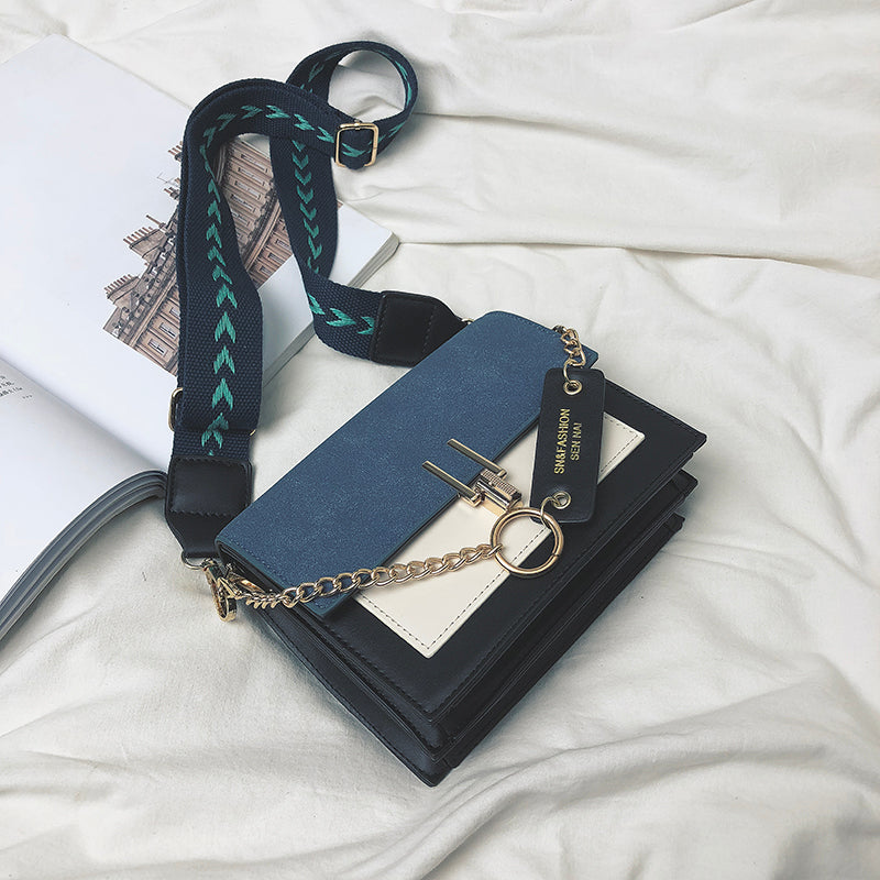 Il dispose d’un rabat en nubuck bleu orné d’une breloque dorée comme fermoir, d’une large bandoulière en tissu amovible, ainsi qu’une petite chaîne à maillons dorés.
