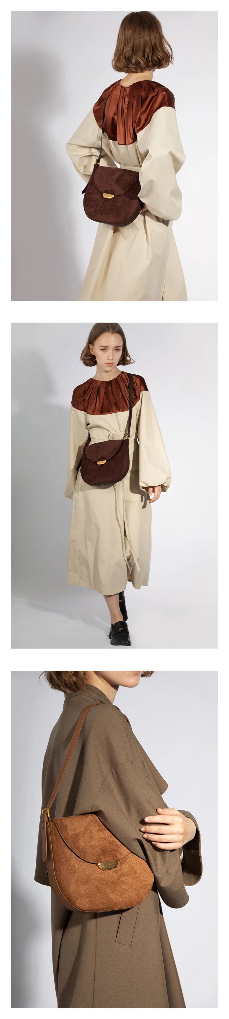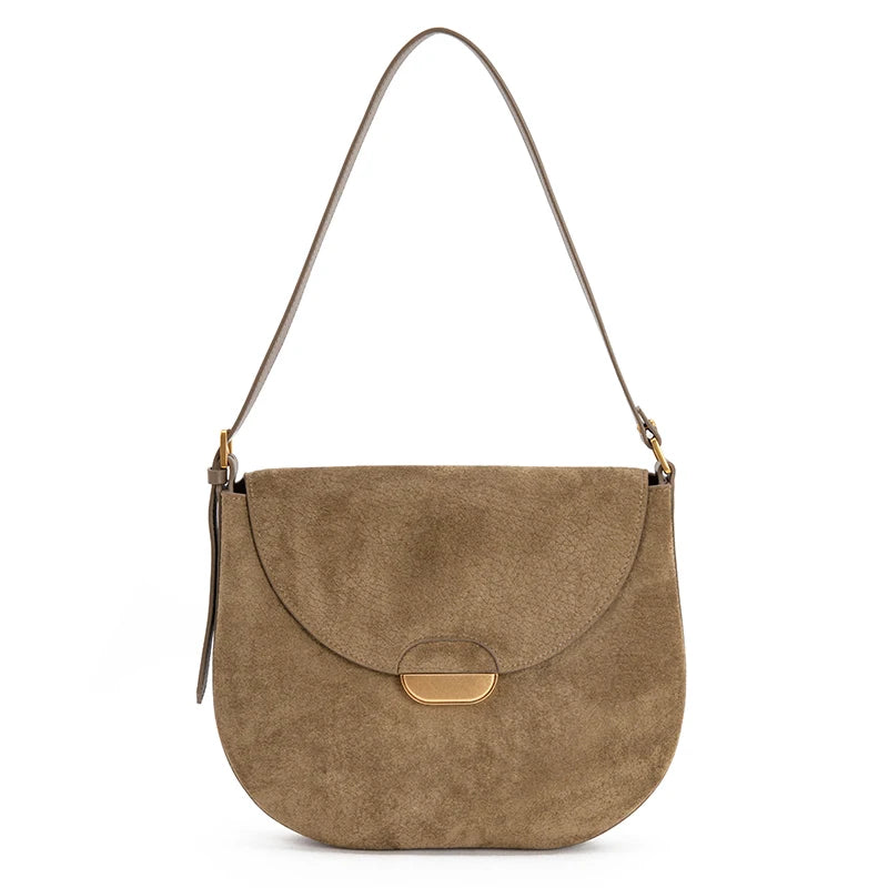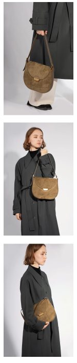 Le design moderne de la forme demi-lune mêle avec finesse la mode et l’intemporalité, en ajoutant une touche chic et unique à votre look. Son profil plat offre un air sophistiqué et discret, ne captant pas trop l’attention mais étant tout de même un accessoire de luxe avec la texture veloutée du daim.