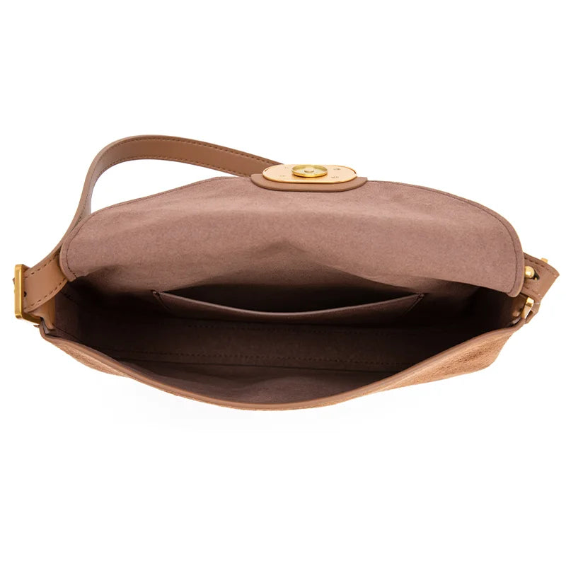 Le Sac à Main en Daim se ferme avec un rabat arrondi orné d’une pièce en métal doré à pression pour toujours sécuriser vos effets personnels. Son intérieur est suffisamment spacieux pour contenir l’essentiel, et une petite poche permet de rester organisé.