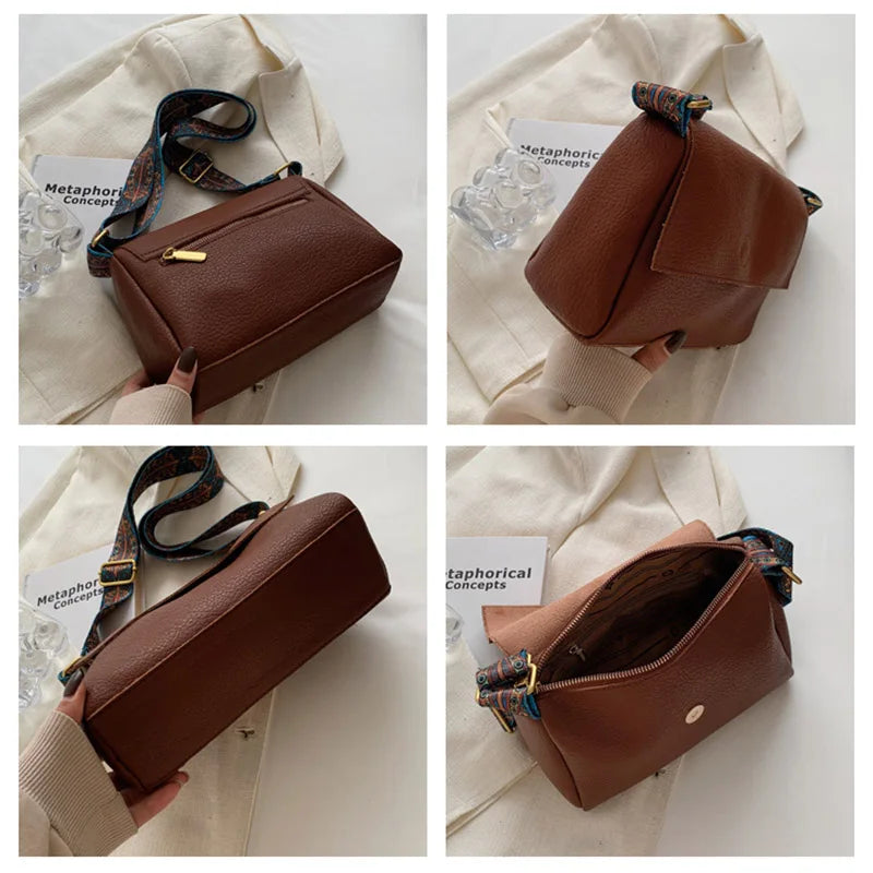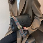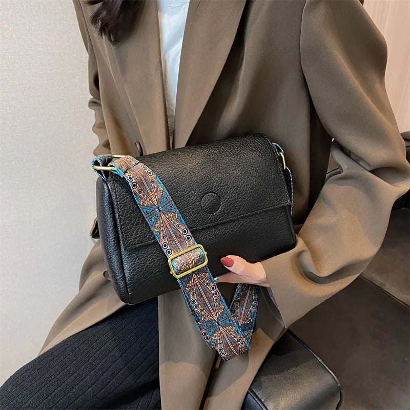 Ce sac bandoulière en similicuir grainé présente un style vintage très en vogue avec son large rabat à pression magnétique pour la fermeture. Sa large bandoulière en tissu surpiqué avec plusieurs rangées de coutures vous garantira un port très confortable. Sa sangle est fabriquée en tissus épais coloré avec des motifs qui illuminent cet accessoire.