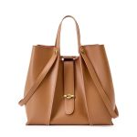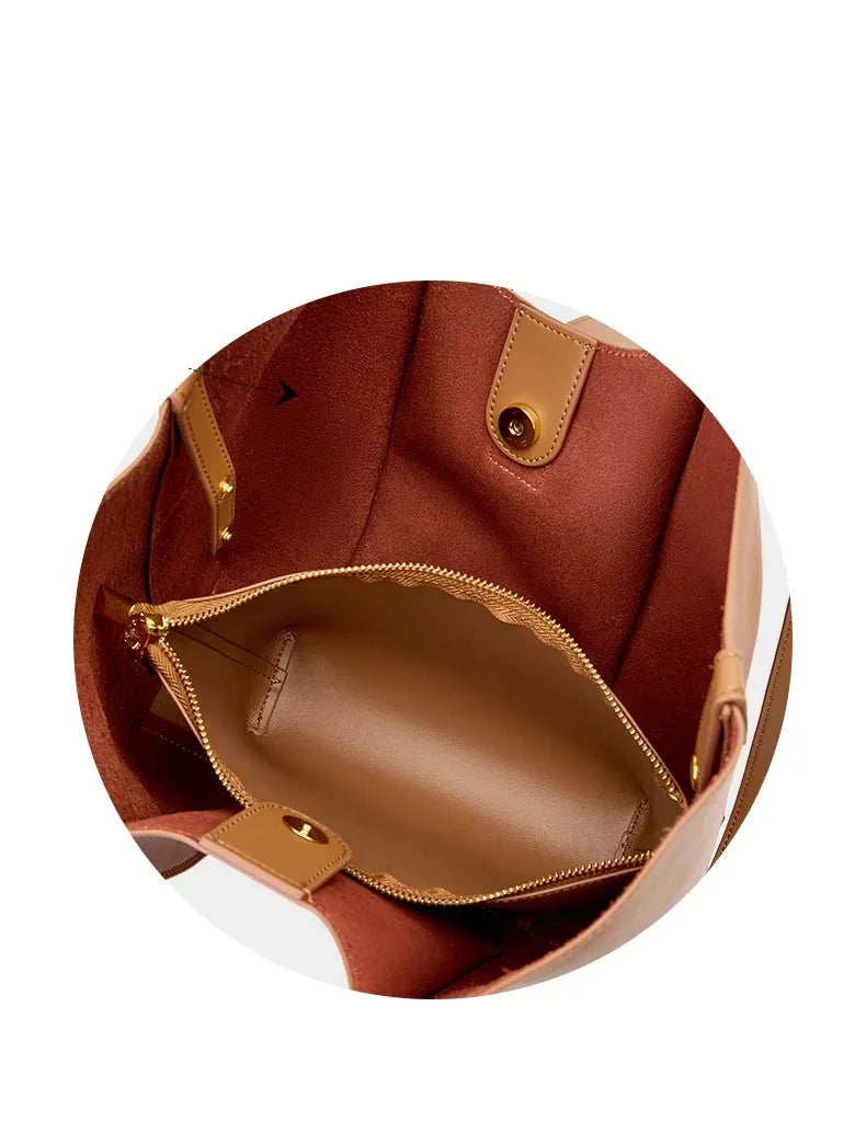 L’intérieur, également en cuir, est particulièrement spacieux, avec une pochette zippée fixée par des boutons-pression, offrant organisation et commodité pendant vos déplacements. Vous pourrez y ranger un ordinateur portable, vos courses, et tous vos essentiels de maquillage et portefeuille sans souci d’espace.