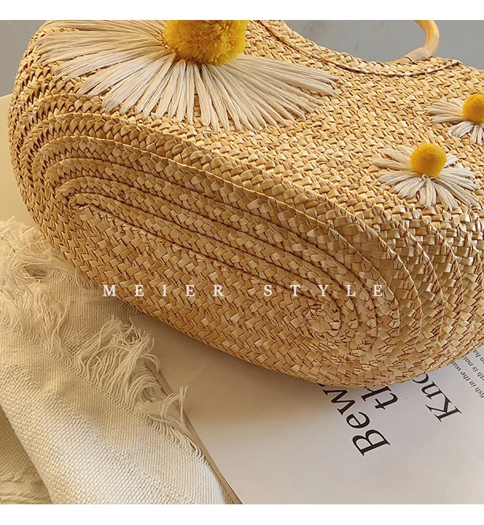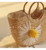 Ce qui distingue ce Sac Panier en Paille, c’est son design floral. Décoré avec des marguerites lumineuses, il respire la nature et la soleil. Avec une grande et deux petites fleurs où les pétales sont en fils brodés et le cœur en pompons jaunes, cela rajoute une note d’originalité et de douceur. Les anses en bois rondes accentuent le côté naturel et artisanal du sac, offrant un grand confort, que ce soit à la main ou au bras. Cette combinaison de matériaux naturels et détails floraux en fait un accessoire unique et sophistiqué.